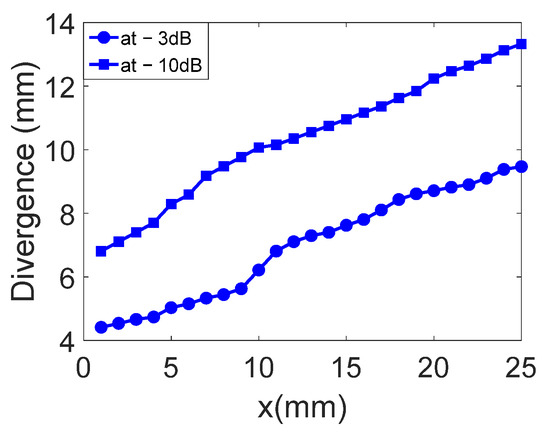 Beam width in millimeters at −3 dB and −10 dB is estimated for each profile obtained with the divergent IDT.