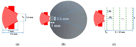First, a divergent IDT was tested, where the electrodes were shaped as circular arcs with a common center of curvature. This solution is the most natural choice for achieving effective wave divergence. The IDT was constructed with 25 pairs (Table 1) of electrodes deposited on a Y128° lithium niobate substrate [29]. The electrode widths were approximately 65 µm, corresponding to a quarter wavelength at 15 MHz, given the SAW propagation speed in lithium niobate at around 4000 m/s. The angular aperture was ±30 degrees, with an inner curvature radius of 2.8 mm and an outer curvature radius of 9.3 mm for the annular sector formed by the IDT. The width at the outer edge of the IDT is 10 mm, and the focal point is located 2.3 mm from the inner edge of the IDT (Figure 5a). This configuration requires a contact area of about 1 × 10 mm (10 mm2) between the SAW emitter (lithium niobate) and the silicon wafer coating to be characterized (Figure 5b).