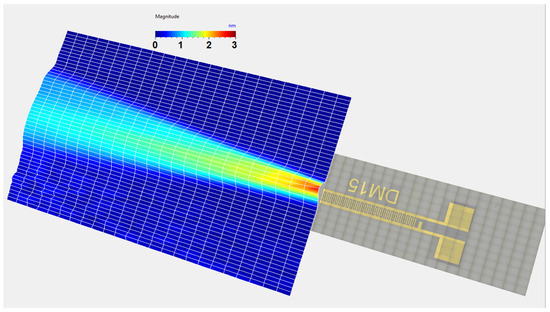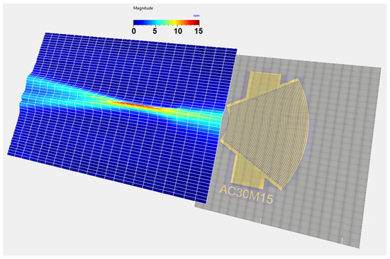 This configuration requires a contact area of about 1 × 1 mm (1 mm2) between the IDT and the silicon wafer (Figure 18b). The displacement field profile was measured in the same way as for the other IDTs (Figure 18c). The displacement field for the narrow IDT is shown in 2D in Figure 19 and in 3D in Figure 20. The SAW-induced displacements are on the order of nanometers, and the beam diverges with an angle of approximately 15 degrees.