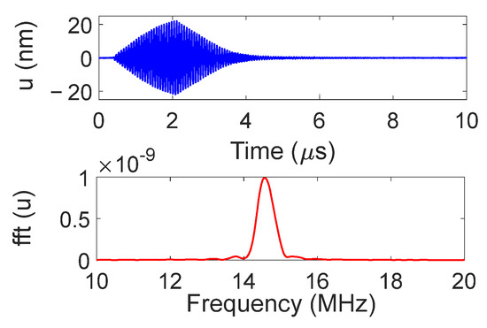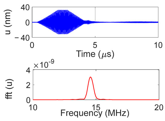 The temporal and frequency response of the normal displacement measured at point “o” for the convergent IDT is shown in Figure 14. The displacement amplitude of approximately ±30 nm is satisfactory for the NDT goals, and the signal-to-noise ratio is decent (40 dB). Figure 15 presents the maximum normal displacement for each scan line obtained with the convergent IDT. The decay in displacement is again due to wave attenuation and beam divergence.