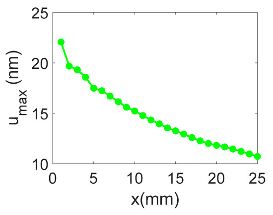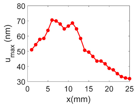 The temporal and frequency response of the normal displacement measured at point “o” for the divergent IDT is shown in Figure 7. The displacement amplitude of approximately ±20 nm is satisfactory for the NDT goals, and the signal-to-noise ratio is quite acceptable (37 dB). Figure 8 presents the maximum normal displacement for each profile (for a given x-coordinate) obtained with the divergent IDT. The decay in displacement is due to the attenuation of surface acoustic waves on the lithium niobate and the beam divergence, which reduces power density.