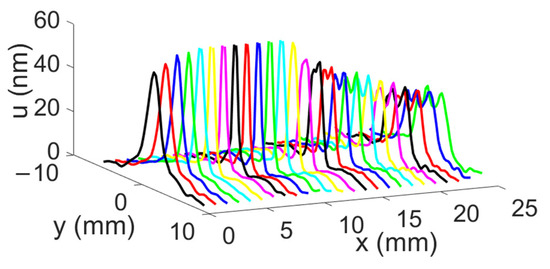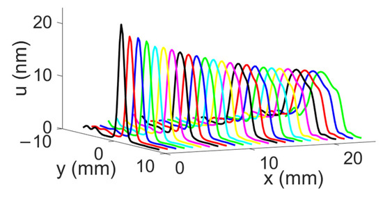 This configuration requires a contact area of about 1 × 3.4 mm (3.4 mm2) between the IDT and the silicon wafer (Figure 11b). To verify the capability of the convergent IDT to produce a divergent beam, the acoustic field profile was measured with LDV using the same scanning settings as described above for the divergent IDT. The distance between the last electrode and the first scan line is defined by x0 = 0.5 mm (Figure 11c). The displacement field obtained with the convergent IDT is shown in 2D in Figure 12 and in 3D in Figure 13. The SAW-induced displacements are on the order of nanometers, and the acoustic beam diverges with an angle of approximately 15 degrees.