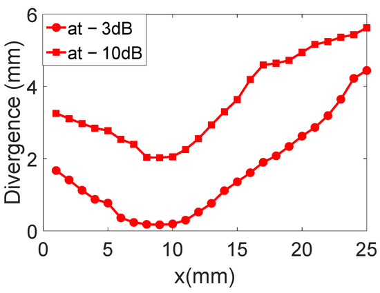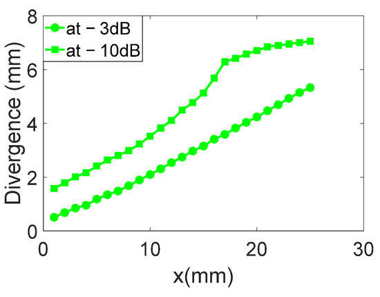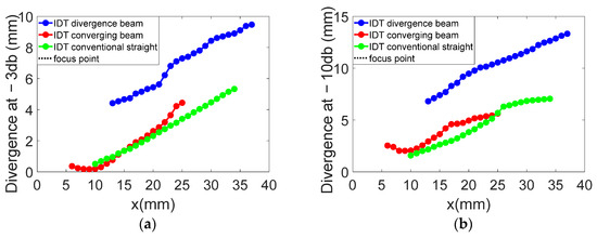 With regard to the divergence angles obtained on the three transducers, the results are shown in Figure 25 at −3 dB and −10 dB. The results show that all the solutions generate divergent SAWs, giving divergences of 14.7, 15.2, and 14.7°, respectively. The slopes of all the figures shown in Figure 26 are virtually identical. Of course, for the convergent IDT, only the part at the end of the focal point (x = 10 mm) should be considered.