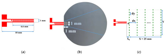 (a) Schematic of the divergent IDT; (b) contact area (hatched zone) between the divergent IDT and the silicon wafer; and (c) scanning points for the displacement field measurement on the LiNbO3 substrate.