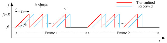 Frequency Modulated Continuous Wave (FMCW) mmWave radar transmits millimeter-wave signals through the transmitting (TX) antenna, and utilizes the receiving (RX) antenna to acquire the echo signal reflected by the target. Positional information, such as range, velocity, and angle, is generated via a specific signal processing method [37,38,39]. The basic waveform of FMCW radar is a sawtooth wave, whose frequency varies linearly with time. Such a linear frequency-modulated pulse is generally referred to as a chirp, and each radar frame contains N chirps, as shown in Figure 1. In practice, FMCW radar usually transmits multiple frames at a time in order to obtain better results. Specifically, the start frequency is , the time duration of a chirp is , and the bandwidth is denoted as , where k is the sweep slope.