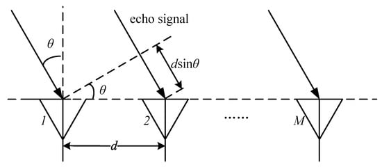 In order to obtain the three-dimensional spatial coordinates of the point cloud, it is also necessary to estimate the angular parameters. The angle of the target is usually estimated on the horizontal plane, which can also be referred to as the direction of arrival (DoA). From the aforementioned ranging and velocimetry methods, it can be seen that small changes in target distance can lead to a phase change in the IF signal at the peak of the Range FFT or Doppler FFT. The characteristics of the phase change at the peak can be used to estimate the target angle, and this method requires at least two RX antennas. An example of the RX antenna array is shown in Figure 2. When an echo signal from the target reaches adjacent RX antennas, it experiences a propagation distance difference. Given that the spacing between adjacent antennas is d, this distance difference is , where represents the DoA of the signal. The phase change can be expressed as . Then, can be calculated as