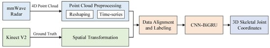 In contrast to previous studies, our proposed human skeletal pose estimation system employs a self-developed BHYY_MMW6044 59–64 GHz mmWave radar device, combined with a unique CNN-BiGRU architecture for sliding window temporal processing and spatio-temporal feature modeling, which is capable of accurately predicting the 3D coordinates of all 25 skeletal joints of the human body. The main contributions of this paper are summarized as follows:
