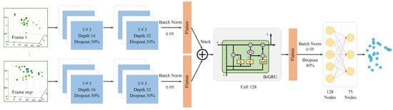 The input to the CNN module consists of point cloud data after sliding window processing. The convolution operation is applied separately to each frame to extract spatial features. The module comprises two CNN layers with a kernel size of , and the number of channels in these layers is 16 and 32, respectively. The activation function used is the Rectified Linear Unit (ReLU). The momentum of the batch normalization layer is set to 0.95 to stabilize the data distribution of each layer, reduce internal covariate shift by normalizing the data in each mini-batch, and accelerate the training process, thereby improving the model’s convergence speed. To prevent overfitting, a Dropout layer (with a dropout rate of 0.3) is added after each CNN layer, enhancing the model’s generalization capability. Finally, the outputs from the CNN layers are passed through a flattening layer, which transforms the 2D feature maps into 1D vectors. These vectors are arranged in chronological order to create time-series data that meet the input requirements of the BiGRU module, providing sufficient spatial feature information for subsequent temporal modeling.