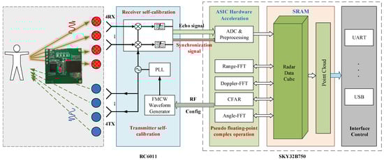 mmWave radar: We developed a mmWave radar, named BHYY_MMW6044, and its structure is shown in Figure 7. Its RF chip is RC6011 and the processing chip is SKY32B750, both of which are independently developed by SKYRELAY (Beijing) Technology Co., Ltd., Beijing, China. The RC6011 packs four transmit and four receive channels, operating within the 60 GHz frequency band. Meanwhile, the SKY32B750 emerges as a dedicated radar processing chip, armed with advanced radar computing cores such as FFT and CFAR, which reduces the complexity, cost, and power consumption of the radar system. In the current study, all radar processing tasks are executed on BHYY_MMW6044. Subsequently, the point cloud results are transmitted in real-time to a computer via the Universal Asynchronous Receiver–Transmitter (UART) interface. The average power of BHYY_MMW6044 is only 570 mW.