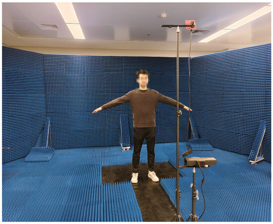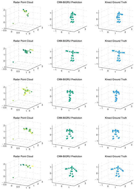 Test datasets: We constructed a large-scale dataset to validate the effectiveness of the sliding window-based CNN-BiGRU architecture. The experiment involved three subjects of varying body sizes, each performing ten predefined movements: left upper limb stretch, right upper limb stretch, double upper limb stretch, left front lunge, right front lunge, squat, left lunge, right lunge, left limb stretch, and right limb stretch, involving varying degrees of joint movement and postural changes. This diverse set of actions enables a comprehensive evaluation of the model’s ability to capture complex human postures, while also enhancing its robustness and generalization ability in real-world application scenarios. Data acquisition was conducted in a controlled experimental environment, as shown in Figure 9, with each subject performing each action for 5 min. After data collection, we synchronized the timestamps of the Kinect and mmWave radar to ensure accurate pairing of the frames, resulting in 179,751 frames of aligned data. Each frame of the Kinect data contained 25 3D joint coordinates, while the radar point data consisted of four dimensions: the 3D spatial coordinates and Doppler velocities. This dataset serves as the foundation for subsequent model training and analysis.
