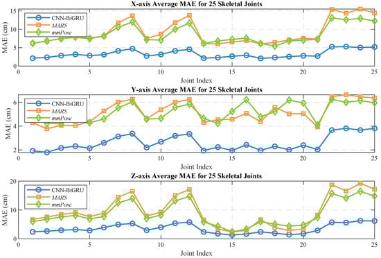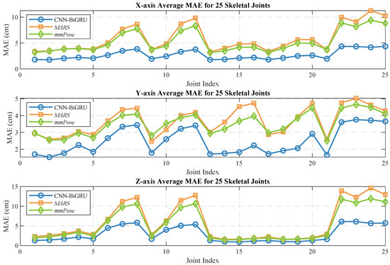 The average MAE and RMSE for 25 human skeletal joints on the X-, Y-, and Z-axes of the four models are shown in Table 5.