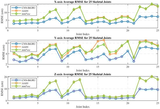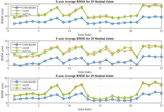 Human pose estimation datasets are often specific to the sensor type, data format, and acquisition conditions, which can significantly impact model performance and applicability. To ensure a fair comparison between different models, it is essential to select a consistent dataset for comparative experiments. In this study, we selected both the self-constructed dataset and the publicly available dataset provided in [36], using MARS [36] and mm-Pose [35] as the benchmark models for performance comparison. The MARS model uses CNNs to extract 5D radar point cloud features and outputs the coordinates of 19 skeletal joints, while the mm-Pose model is based on a forked CNNs architecture and predicts the locations of 17 skeletal joints. For a unified comparison, we adjusted the output layer parameters of both models to enable them to output the coordinates of 25 skeletal joints. Model performance was evaluated using the mean absolute error (MAE) and the root mean square error (RMSE) metrics. To reduce systematic errors, each model was trained 10 times, and the results were averaged. Figure 10 and Figure 11 show the localization errors of the three models on the MARS dataset for the 25 skeletal joints, while Figure 12 and Figure 13 show the corresponding errors on the self-built dataset, and Figure 14 displays the visualization results of our method. Table 2 presents the mean errors of the three models across the two datasets.