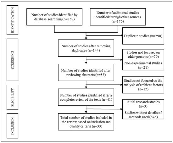 Following the process depicted in Figure 1, the initial search of the databases gave rise to 258 records. Additionally, through searches of other sources, 176 articles were retrieved, making a total of 434 studies. After eliminating duplicate studies and those with little relationship to the topic, we excluded a total of 290 records, retaining 144 articles considered relevant.