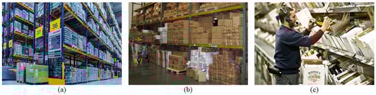 As shown in Figure 1, the environments where order picking is applied within logistics warehouses can be classified into three categories based on operational objectives: storage warehouses [], distribution centers [], and fulfillment warehouses []. Storage warehouses focus on efficiently storing large quantities of goods that require long-term storage, primarily managing items on a pallet basis to optimize space utilization and prevent inventory damage. Distribution centers emphasize the rapid inbound and outbound handling of most goods on a box basis to facilitate efficient distribution to various destinations. These centers primarily operate in a Business-to-Business (B2B) context, requiring high inventory turnover and fast processing speeds. On the other hand, fulfillment warehouses are designed for Business-to-Customer (B2C) operations, focusing on processing individual customer orders, and emphasizing rapid packing and delivery. This study aims to improve the order picking process within distribution centers, which is a BBS that manages products by box, enabling fast processing and efficient distribution to various destinations.