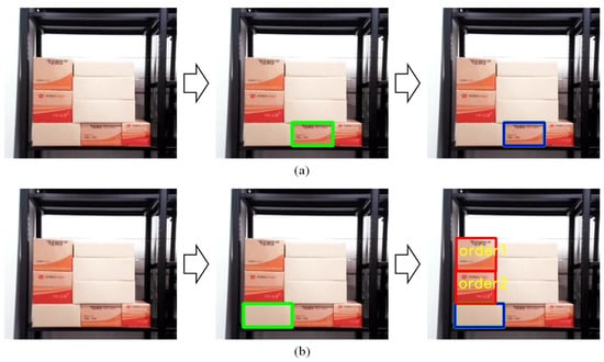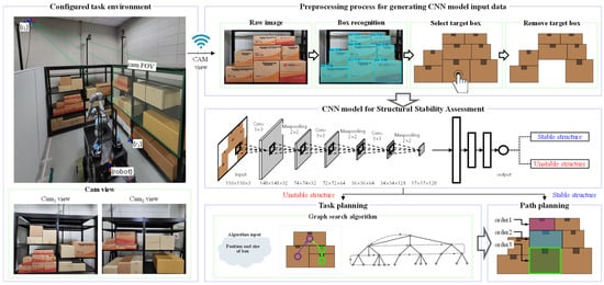 The CNN model, trained using a dataset generated through simulations in CoppeliaSim, demonstrated a high-test accuracy of 95.1% in stability assessments. The dataset, consisting of approximately 40,000 labeled images, provided diverse scenarios for model training, enabling robust generalization to real-world conditions. Real-time experiments conducted in a simulated distribution center environment further validated the model’s performance. By accurately recognizing box front faces and assessing complement structure stability, the system differentiated between stable and unstable scenarios. In cases where the complement structure was determined to be stable after the removal of the target box, the system generated a direct picking path, allowing for efficient order fulfillment. Conversely, when the complement structure was unstable, the graph G-based task planning algorithm was employed to prioritize the removal of upper boxes before safely picking the target box. This dual approach not only ensures the structural stability of stacked boxes, but also optimizes efficiency by minimizing unnecessary work, providing a process that is 1.6 times faster than the traditional order picking process. The results of this study highlight the practical applicability of the proposed framework in dynamic logistics environments, such as distribution centers, where high inventory turnover and fast processing speeds are essential. By combining high-performance object recognition, stability assessment, and task planning, the framework effectively addresses the demands of modern logistics operations. Future work could explore further optimization of task planning algorithms and the integration of more advanced simulation environments to improve the adaptability and scalability of the proposed method in broader logistics scenarios. We also plan to conduct additional research on algorithms that can be applied in situations other than those included in this study.