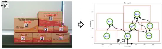 After the stability assessment of the complement structure is conducted using the CNN model, the next step is to generate the optimal path for picking the target box based on the assessment results. If the complement structure is deemed unstable, directly picking the target box is infeasible due to the risk of structural collapse. In such cases, additional task planning is required. As shown in Figure 5, task planning involves defining each box as a node in a graph and representing the positional relationships between boxes as edges connecting these nodes. Utilizing a previously developed graph G-based algorithm [], the shortest path is generated to pick the target box while maintaining the stability of the overall structure. On the other hand, if the complement structure is determined to be stable, no additional task planning is necessary. In this scenario, a direct picking path for the target box is generated, maximizing the efficiency of the order picking process. The overall pseudo code for this approach is shown in Algorithm 1, and it can be applied practically in complex logistics environments by ensuring both safety and operational efficiency of the order picking process by utilizing this approach.