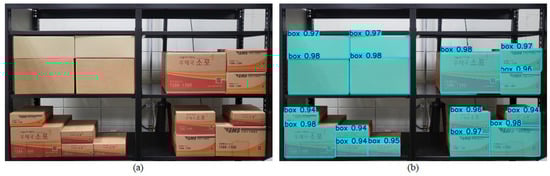 To construct an environment similar to a distribution center, which is a BBS environment, racks were installed, and boxes were stacked on the racks, as shown in Figure 6a. This setup was used to conduct experiments on the method for generating optimal picking paths using the CNN model. To recognize the boxes on the racks, a YOLOv8-seg-based segmentation model, trained specifically for this purpose, was utilized. The results of this segmentation are shown in Figure 6b. These results demonstrate the model’s ability to accurately recognize only the front faces of the objects (boxes) in a complex distribution center environment. Using the bounding box coordinates of the recognized front faces, input data for the physical intuition-based CNN model will be generated.