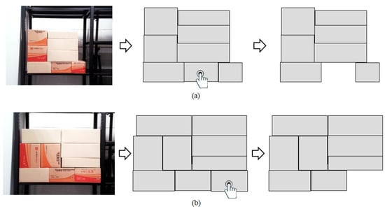 The target box was selected using the direct teaching interface, and the complement structure was generated to evaluate its stability using the CNN model. Based on the evaluation results, the optimal picking path was determined. If the complement structure, excluding the target box, was deemed stable, as shown in Figure 10a, the target box could be picked directly. In this case, a direct picking path for the target box was generated to maximize efficiency. Conversely, if the complement structure was assessed as unstable, as illustrated in Figure 10b, direct picking of the target box was not possible due to the risk of structural collapse. In this scenario, a path was generated to first pick the upper boxes above the target box. A pre-developed graph G-based task planning algorithm was used to achieve this. As shown in the far-right illustration of Figure 10b, this algorithm generated a safe and efficient path, ensuring the stability of the structure while allowing the target box to be picked successfully.