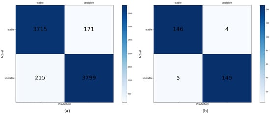 The CNN model was trained to assess the stability of complement structures using input images where the target box was removed, as recognized by the YOLOv8-seg-based segmentation model. The training data consisted of approximately 40,000 samples that were labeled through CoppeliaSim simulation and generated in advance, 80% of which were used as training data, and the remaining 20% were used as validation data. The training result using the training data was 95.4%, and the validation result using the validation dataset showed an accuracy of 94.4%, proving that the model can perform an excellent stability assessment. Additionally, an approximately 10,000-test dataset was generated using CoppeliaSim to evaluate the model. As shown in Table 2, the accuracy achieved using the test dataset was 95.1%, and the calculated confusion matrix is presented in Figure 8a.