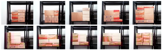 To test the model using images generated in a real-world scenario, the preprocessing steps described in Section 3.1 were applied to create input data for the CNN model. In the real environment, as shown in Figure 9, a total of 10 structures were built for testing purposes. In each structure, 1–2 target boxes were selected, resulting in the generation of 300 complement structure images. Using the generated images to test the CNN model, the results showed an accuracy of 97%, as seen in Table 2, and the calculated confusion matrix can be found in Figure 8b. These results validate the capability of the model to perform real-time stability assessments with high accuracy in complex logistics environments such as distribution centers.