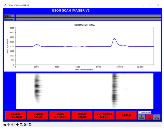 In the Figure 6, the first reflection was from the object and the other reflections were from the background wall. In Figure 7, an image line is obtained by extracting the envelope of the signal, which is called an A-Scan, and then converting the vertical value to the pixel color for the corresponding sample (lighter pixel color for the higher vertical value).