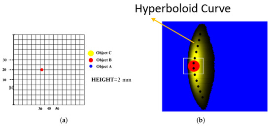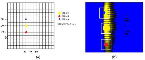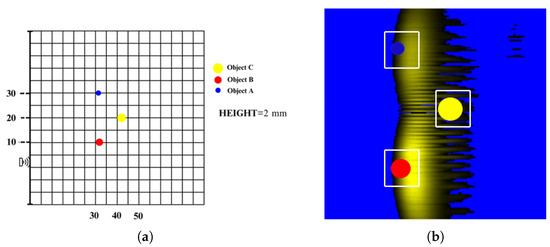(a) Example of object positioning (Object A, Object B and Object C); (b) representation of objects on the image (Object A, Object B and Object C).