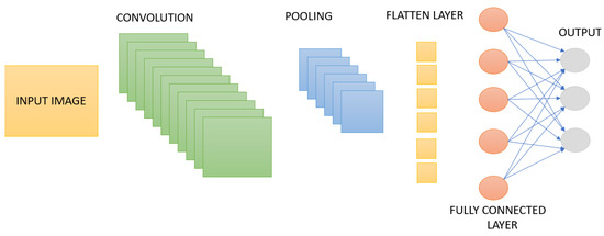 Convolutional Neural Networks (CNNs) are a deep learning model that combines fully connected layers with convolutional layers. Mathematically based on the convolution operation in the field of signal processing, CNNs work with the principle of cross-correlation and thus extract important features from data. The basic structure of CNNs consists of two main layers. These are feature extraction and classification layers. While feature extraction is usually performed by convolutional layers and pooling layers, the classification process is performed through fully connected layers. Convolutional layers are not directly connected to each node in the input layer. Instead, they focus on specific regions through small windows called filters or convolutional kernels. This structure allows the network to learn low-level features, and these features are combined to create higher-level patterns. Another important feature of the CNN algorithm is that it can generalize the features it learns in one region to other regions. This is made possible by sharing parameters in the filters and allows the model to produce a similar output at different locations. Pooling layers reduce the computational load and help prevent the overfitting problem of the model. Thus, CNN structures provide a more effective and efficient learning process [6,33]. The general block diagram of the CNN architecture is given in Figure 14.