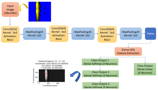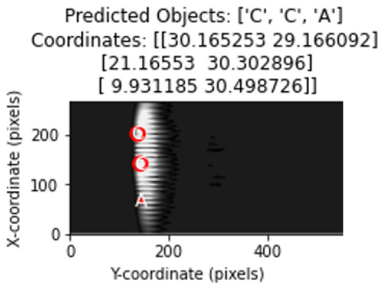 Each image was converted to grayscale and normalized according to the input size of the model (128 × 128 pixels). These pre-processing steps optimized the structure of the images to allow the model to predict object types and coordinate information more accurately. Assuming that there are a maximum of three objects in the images, missing objects were filled with the label −1 and coordinates [0, 0].