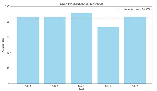 Figure 17 shows the k-fold cross validation accuracies across different folds during the evaluation of the proposed CNN model. Each vertical column in the graph represents the model accuracy for a particular fold during cross-validation. The model shows consistent performance across most folds, with an accuracy ranging from approximately 83% to 90%. The dashed red line represents the average accuracy across all folds, which is approximately 84.55%. This provides a general indication of the model performance stability in different data splits. The fourth fold has a significantly lower accuracy compared with the other folds. This can be attributed to the cases of complex images and lack of clarity during multiple object recognition. The model shows stability and relatively high accuracy across most folds, which is a good sign of generalization.