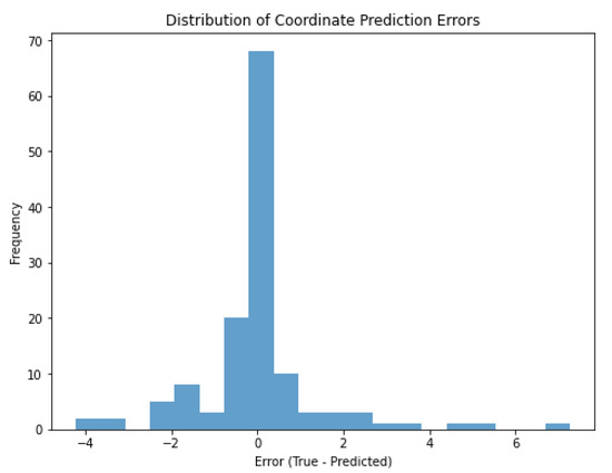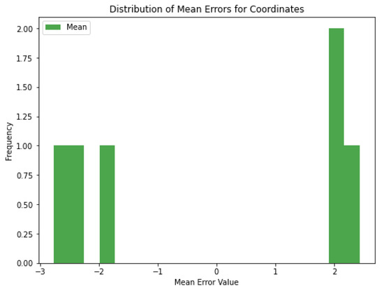 Figure 19 shows the mean errors for each set of coordinates. For some coordinates, the mean error is positive (e.g., around +2 cm) and for others it is negative (e.g., around −2 cm). The mean errors are generally small, indicating that the model is not making large errors. If the errors are not close to zero, this may indicate a slight bias in the model’s predictions. In some cases, the model can be retrained with more data to reduce the bias. Methods such as adding noise can be further diversified to increase the generalization ability of the model.