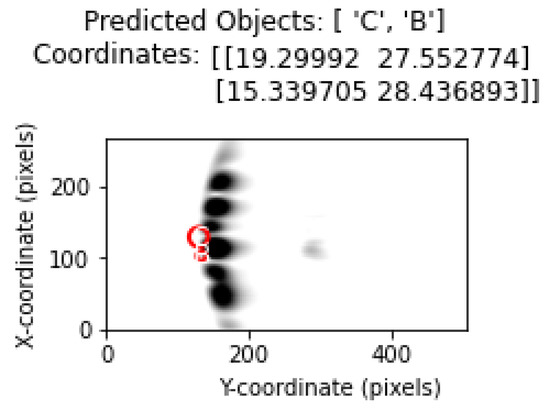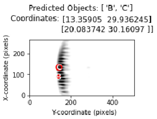 By incorporating different analysis methods into the experimental results, important inferences regarding the limitations and performance of the proposed method have been provided. In this section, the output regarding the system behavior in cases where the objects are closest to each other is analyzed. Figure 22 and Figure 23 shows the location and position estimation of objects as a result of classification in images with two objects. In this part of the study, for two objects, measurements were taken at y = 30 cm and the distance between them on the x-axis was 3, 5, 7, 9 cm, respectively, and classification studies were carried out. In addition, similar measurements were taken at close range by changing the positions of B and C. The results obtained in Table 5 show that, even in the closest situations, the classification success is at an acceptable level.