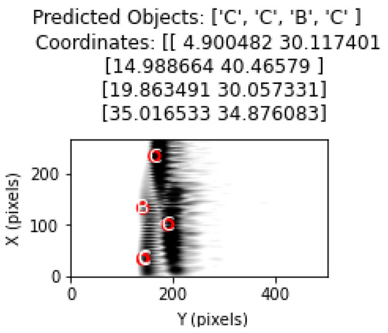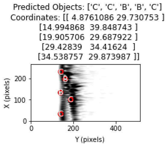 In this section, the performance of the proposed method in cases with four and five objects is analyzed. The classification results obtained in Table 6 and Table 7 for cases with four and five objects show that the proposed method can effectively respond to cases with more than three objects. However, as the complexity increases, the classification performance decreases. Including more cases with four and five objects in the training database will contribute significantly to the classification success. Thus, more information will be extracted from the characteristics of these cases. In the case of four objects in Figure 24, the classification results are quite successful, as in the case of three objects. In Figure 25, the classification performance increased because the B object in the middle was more isolated from the other four objects. The proximity of the B and C objects at the top of the figure had a negative effect on the classification performance. As a result, the system performance and classification success will increase with an effective learning process.
