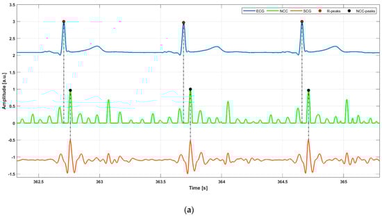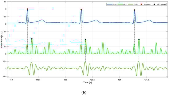 Some excerpts of ECG (blue line), NCC (light green line), and (a) SCG signal (orange line), (b) GCG signal (green line) from subject #5. Red and black points mark the locations of R-peaks and NCC-peaks, respectively.