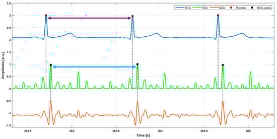 An example of IBI estimation in ECG and SCG signals of subject #5. For the ECG signal, the IBI is estimated as the temporal distance between two consecutive R-peaks (violet double arrow), while the same IBI is estimated for the NCC signal as the temporal distance between the two corresponding successive NCC-peaks (blue double arrow).