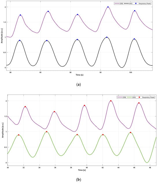 Some excerpts of ERB (purple line) signal and (a) ARG signal (black line), (b) GRG signal (green line) from subject #5. Blue points mark the locations of respiratory peaks on ERB/ARG signals, while red points mark the locations of respiratory peaks on ERB/GRG signals.