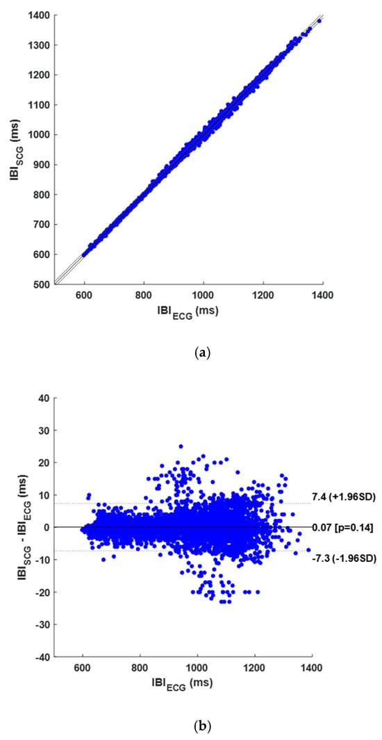 Results of statistical analyses on IBIs obtained from SCG signals: (a) correlation and linear regression plot; (b) Bland–Altman plot.