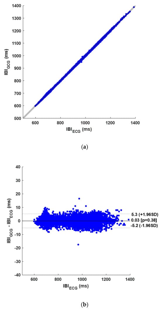 On the other hand, a total of 5506 TPs, 119 FPs, and 154 FNs were identified in the GCG signals, and 5370 IBIs were considered for correlation, linear regression, and Bland–Altman analysis. The results of the heartbeats detection per subject are shown in Table A2 in Appendix A. The GCG signals achieved a sensitivity of 97.3% and a PPV of 97.9% in heartbeats detection. Furthermore, the regression and correlation analysis on IBIs resulted in a unitary slope and an intercept of −0.648 ms (R2 > 0.999), as depicted in Figure 7a. The Bland–Altman analysis reported an LoA of ±5.22 ms and a non-significant bias (p-value of 0.378), as illustrated in Figure 7b. A summary of these results is also provided in Table 1.