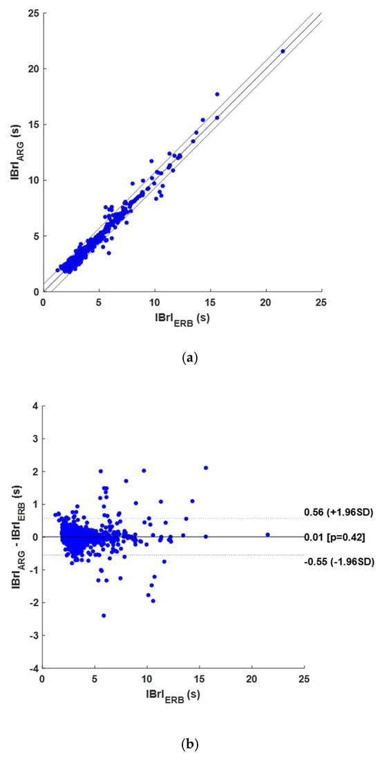 Results of statistical analyses on IBrIs obtained from ARG signals: (a) correlation and linear regression plot; (b) Bland–Altman plot.