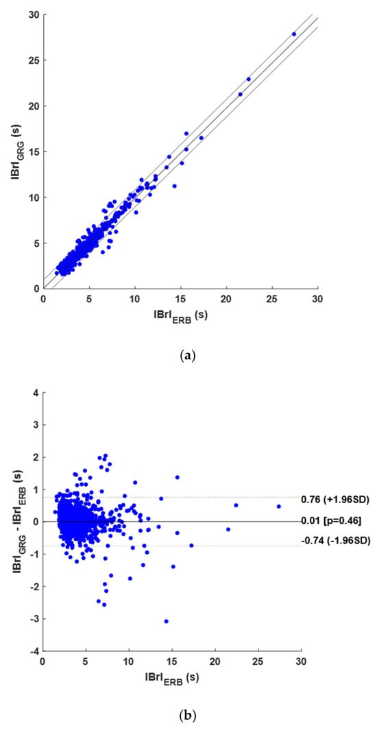Results of statistical analyses on IBrIs obtained from GRG signals: (a) correlation and linear regression plot; (b) Bland–Altman plot.