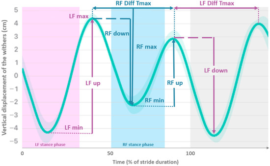 Mean vertical displacement (cm) of the withers plotted against time (expressed as a percentage of stride duration) of a horse showing right forelimb (RF) lameness. Asymmetry Indices (AsI) are AsI-min = RFmin − LFmin/LFup; AsI-max = LFmax − RFmax/LFup; AsI-up = LFup − RFup/LFup; AsI-down = LFdown − RFdown/LFdown and AsI-Tmax = LFdiffTmax − RFdiffTmax/LFdiffTmax. (LF-Left Forelimb).