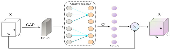 Assume that the input feature map has dimensions , where represents the number of channels, and and denote the spatial resolution of the feature map. Each channel encodes specific information, such as edge features, color, and depth. The features of small objects are often concentrated in only a few channels, while other channels may contain background or irrelevant information. Global average pooling performs spatial compression on each channel, reducing the feature to a single scalar value, yielding the global feature description for each channel. Among them, is the average value of channel , and finally a channel vector is obtained.