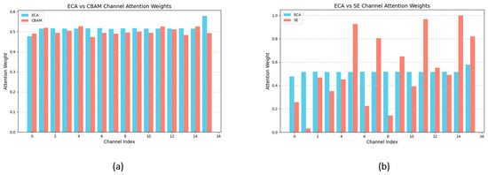 Efficient Attention Mechanism: Small object detection typically encounters challenges related to sparse features and background interference. In such cases, attention mechanisms enhance the model’s feature selectivity, enabling it to automatically focus on the most important aspects of the input data. ECA adapts the convolution kernel size to capture inter-channel dependencies, resulting in a more uniform distribution of attention weights. This adaptation promotes a balanced consideration of the importance of different channels. Such a uniform distribution aids the model in avoiding the neglect of important channels while preventing excessive focus on certain channels, consequently enhancing the recognition accuracy of small targets. In contrast, the attention weight distributions of SE and CBAM are comparatively uneven, with some channels receiving disproportionately high weights while others retain relatively low weights. Furthermore, ECA is computationally efficient, yielding performance improvements for the model without significantly increasing the computational burden. The comparison results are shown in