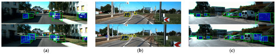 Figure 5b shows that the original model fails to recognize the small target on the left; however, our model successfully detects and frames the pedestrian with a blue bounding box. Lastly,