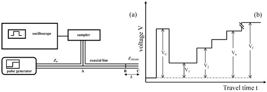 (a) Time Domain Reflectometry (TDR) hardware setup; (b) voltage versus travel time for an idealized TDR waveform, highlighting distinctive signal characteristics resulting from multiple reflections (adapted from [6]).