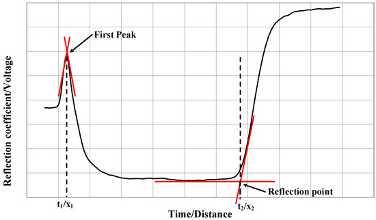 In particular, determining the travel time of the signal along the TDR rods through the soil requires identification of two significant reflections: the first occurs at the head of the TDR probe (commonly referred to as the first peak) and the second occurs at the end of the rods (commonly referred to as the reflection point). These key reflections are illustrated in Figure 2.