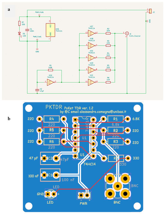 Figure 3a,b present the wiring diagram and printed circuit board (PCB) layout of the proposed TDR device.