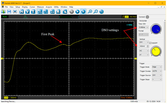 Figure 5 illustrates an example of a TDR signal acquired using PKTDR + DSO as acquired from the Hantek 6000 software (version 2.2.7) included with the Hantek 6254BD. The DSO parameters for accurate TDR signal acquisition are displayed on the right. Specifically, the Time/div setting was fixed at 5 ns and the vertical DSO scale (i.e., voltage) was set to 500 mV.