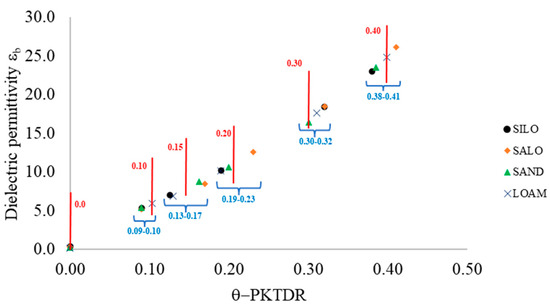 Bulk dielectric permittivity (εb) values measured using the PKTDR device plotted against the estimated θ values, calculated using Equation (2) for the four investigated soils. The red lines and red text represent θ values determined using the thermo-gravimetric method. The graphic also highlights the range of θ variability among the soils in blue text.