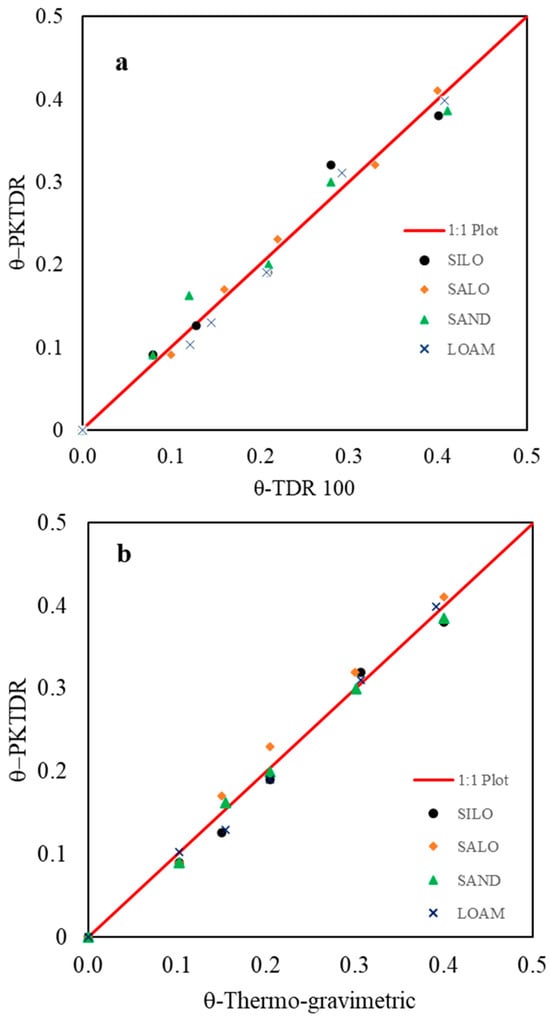 In Figure 8a, the θ values derived from the PKTDR device are compared with those obtained using the commercial TDR100 device. Among the soils, the dielectric responses of the two TDR devices are generally similar and closely align with the 1:1 line, indicating that the PKTDR provides performance comparable to that of the TDR100.