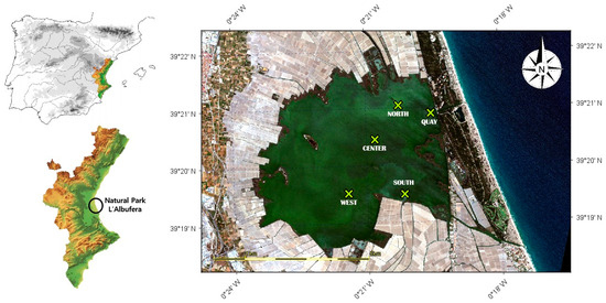 The Natural Park of L’Albufera de València is a coastal wetland located on the south of Valencia city—east of the Iberian Peninsula (Figure 1). It covers an area of approximately 21,000 hectares (ha), comprising 14,000 ha of marshes and 2800 ha of shallow lake.
